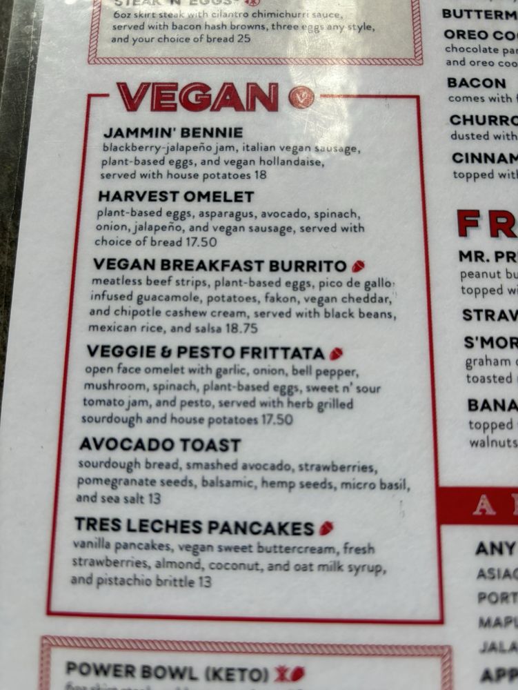 plant-based eggs, asparagus, avocado, spinach, onion, jalapeno and vegan sausage, served with choice of vegan bread